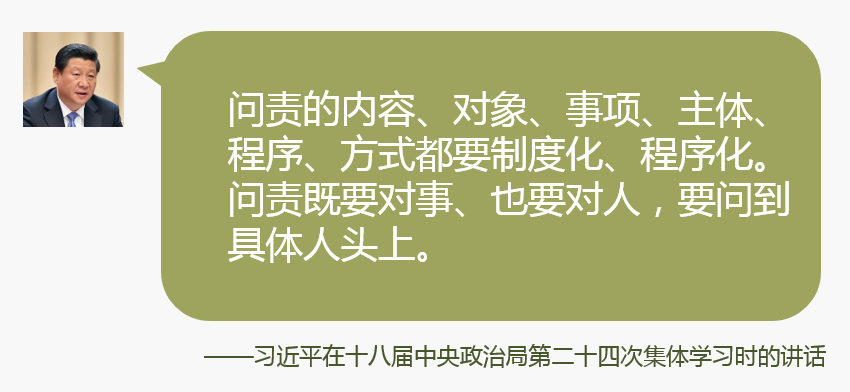 坚持有责必问、问责必严,把监督检查、目标考核、责任追究有机结合起来,形成法规制度执行强大推动力。问责的内容、对象、事项、主体、程序、方式都要制度化、程序化。问责既要对事、也要对人,要问到具体人头上。要把法规制度执行情况纳入党风廉政建设责任制检查考核和党政领导干部述职述廉范围,通过严肃追究主体责任、监督责任、领导责任,让法规制度的力量在反腐倡廉建设中得到充分释放。纪律检查机关要加大监督检查力度,对有令不行、有禁不止的,不仅要严肃查处直接责任人,而且要严肃追究相关领导人员的责任。